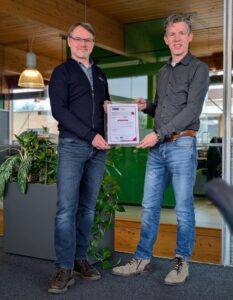 Op de foto is te zien hoe Raymond Moelard en Marco Strokamp van Enerdeco samen één van de behaalde BRL 9500-certificaten presenteren. Een moment om trots op te zijn!